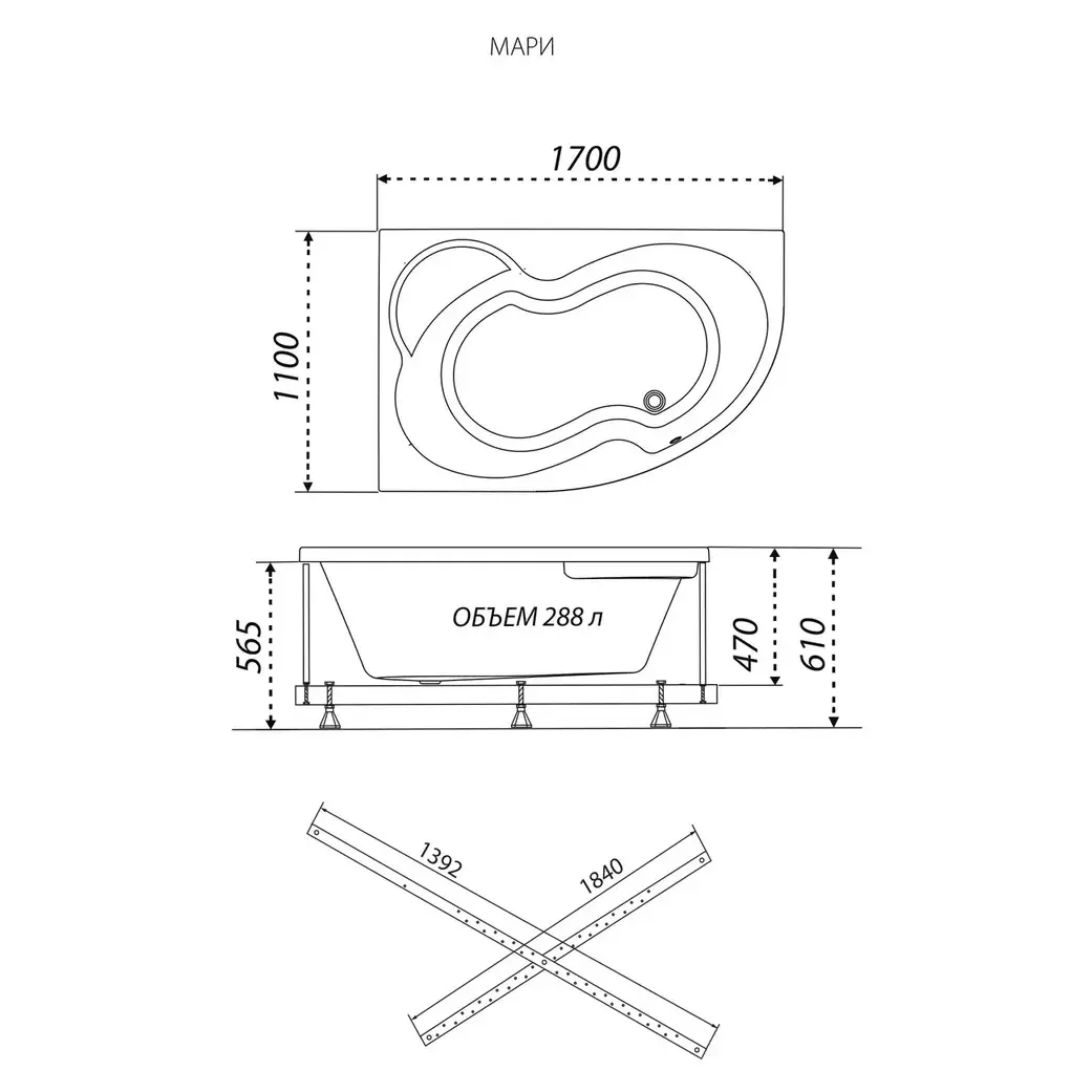 Акриловая ванна Triton из коллекции Мари имеет размер 170х110 см. Форма асимметричная. Страна изготовитель — Россия. Каркас и установочный комплект, слив-перелив не входит в базовую комплектацию и приобретается отдельно. Дополнительно комплектуется смесителем, передней и(или) боковой панелью.